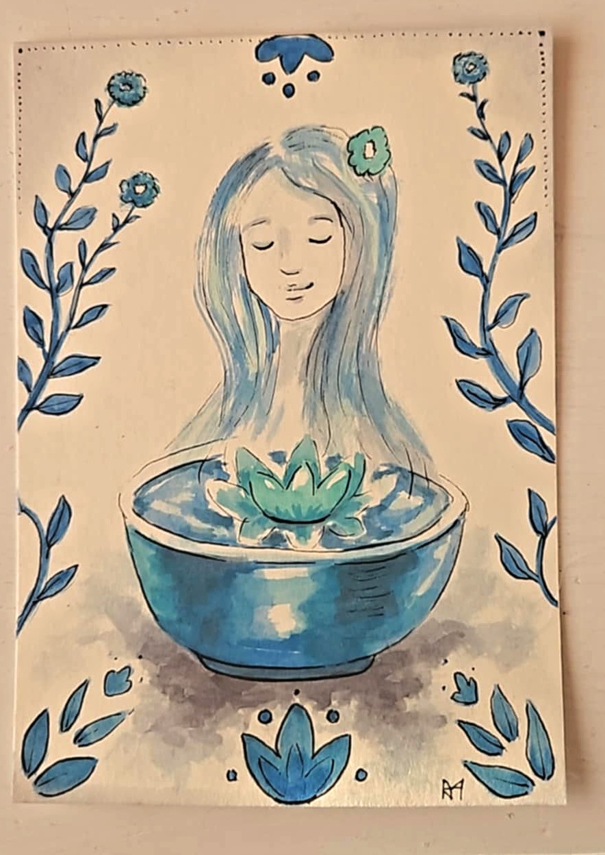 Pohlednice Bohyně čaje zobrazuje tichý archetyp ženské přítomnosti, která bdí nad okamžikem ztišení, nad rituálem čaje a nad prostorem mezi myšlenkami. Jemná tvář vystupující z páry nad šálkem připomíná, že i obyčejný každodenní úkon se může stát posvátným, pokud mu věnujeme plnou pozornost.